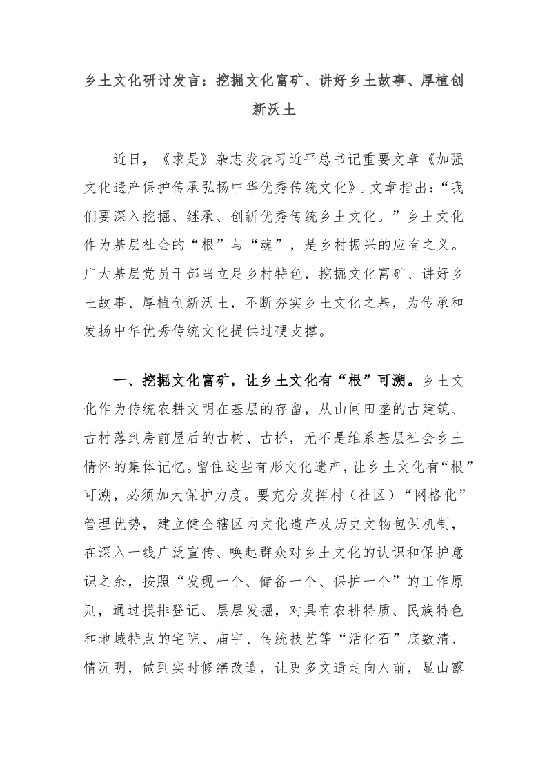 乡土文化研讨发言:挖掘文化富矿、讲好乡土故事、厚植创新沃土