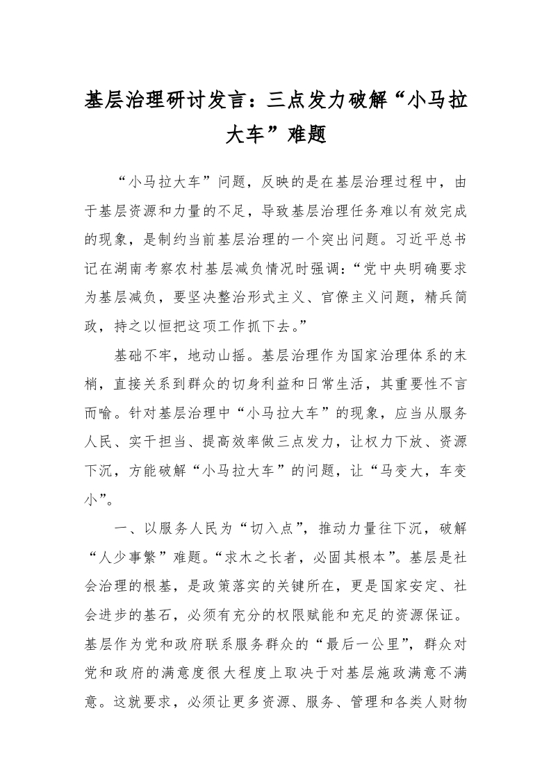 基层治理研讨发言:从服务人民、实干担当、提高效率做三点发力破解“小马拉大车”难题