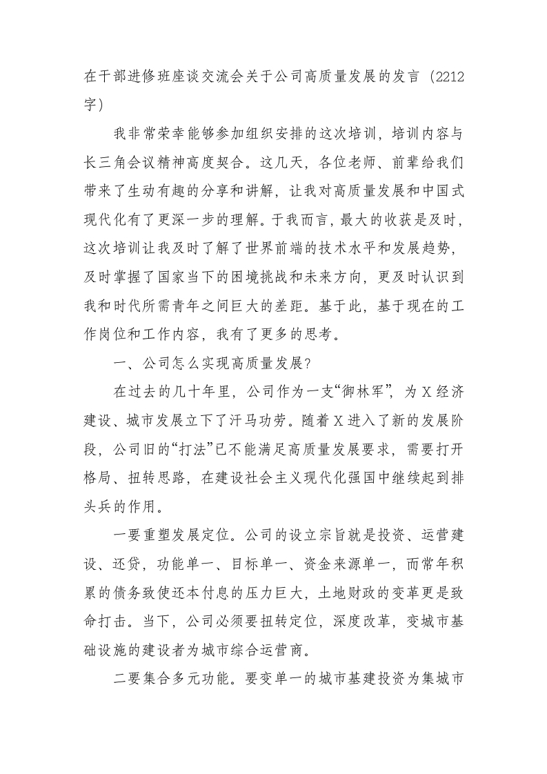 / 在干部进修班座谈交流会关于国企高质量发展的发言(2212字)