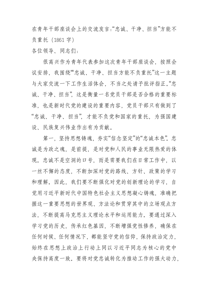 在青年干部座谈会上的交流发言:“忠诚、干净、担当”方能不负重托(1861字)
