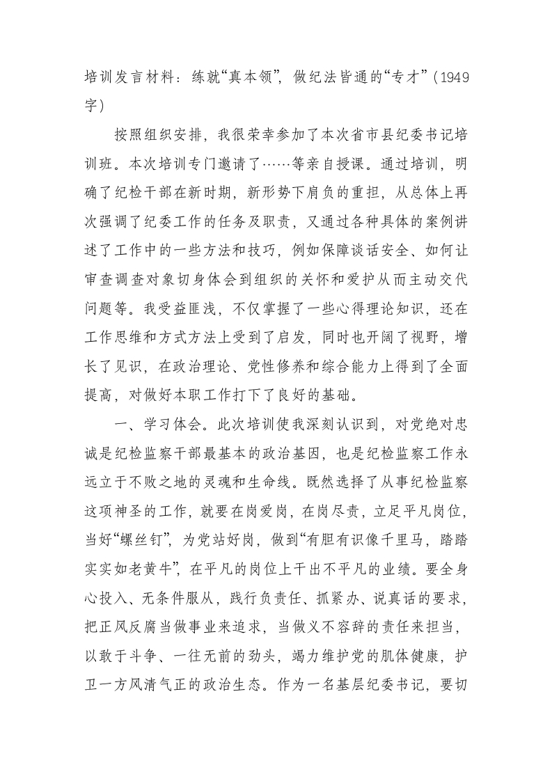 / 培训发言材料:练就“真本领”,做纪法皆通的“专才”(1949字)