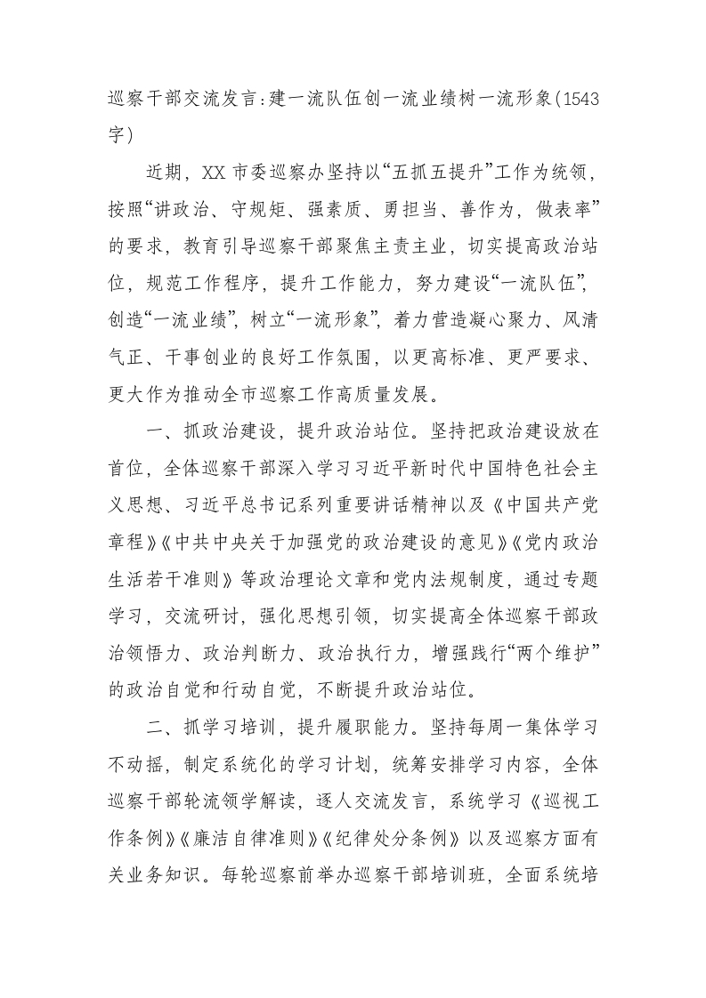 / 巡察干部交流发言:建一流队伍创一流业绩树一流形象(1543字)