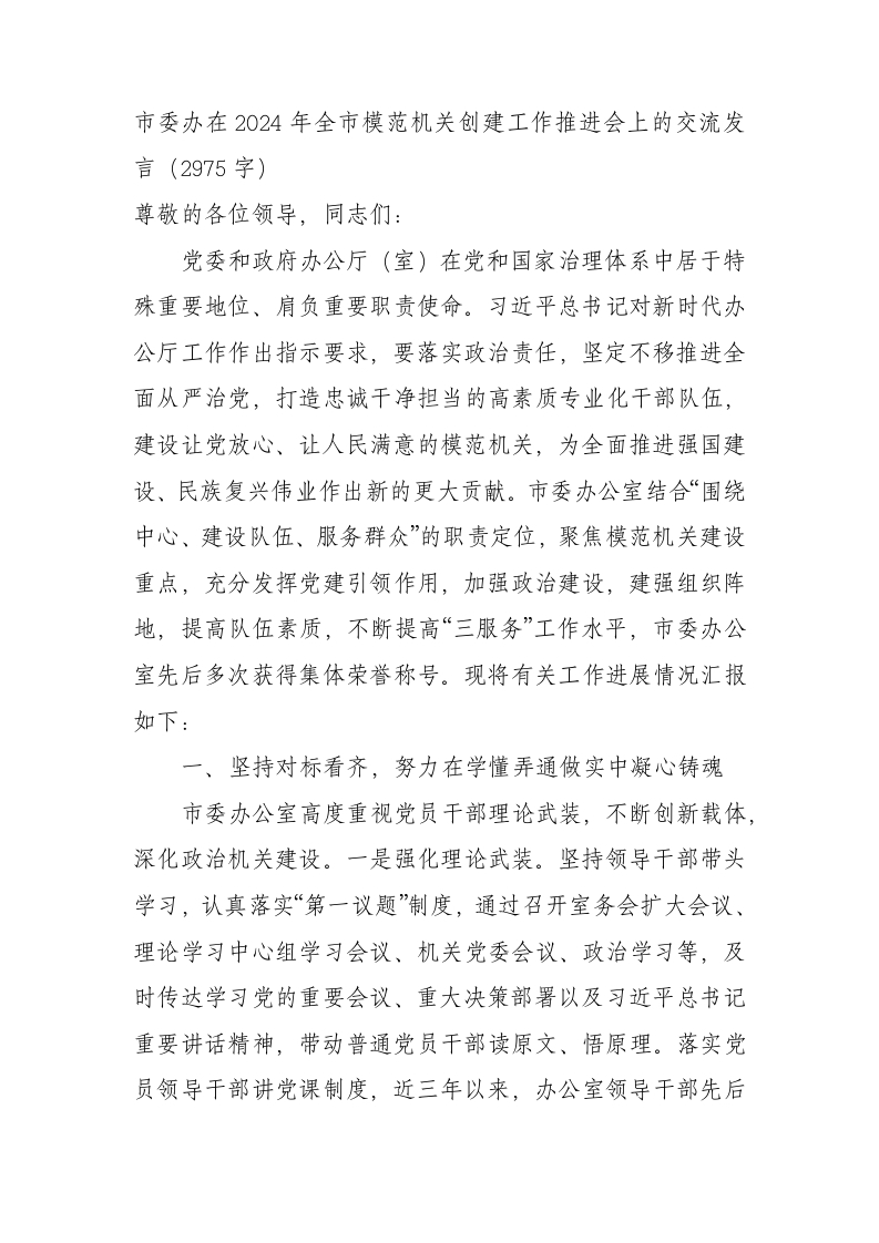 / 市委办在2024年全市模范机关创建工作推进会上的交流发言(2975字)