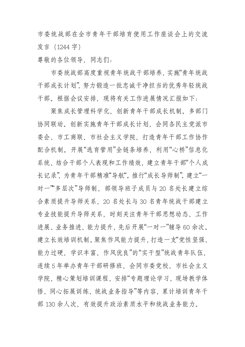/ 市委统战部在全市青年干部培育使用工作座谈会上的交流发言(1244字)