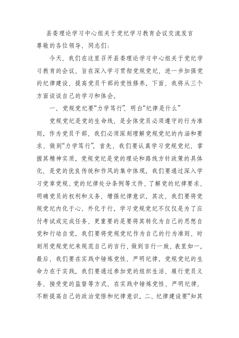 / 县委中心组党纪学习教育会议心得研讨发言1500字
