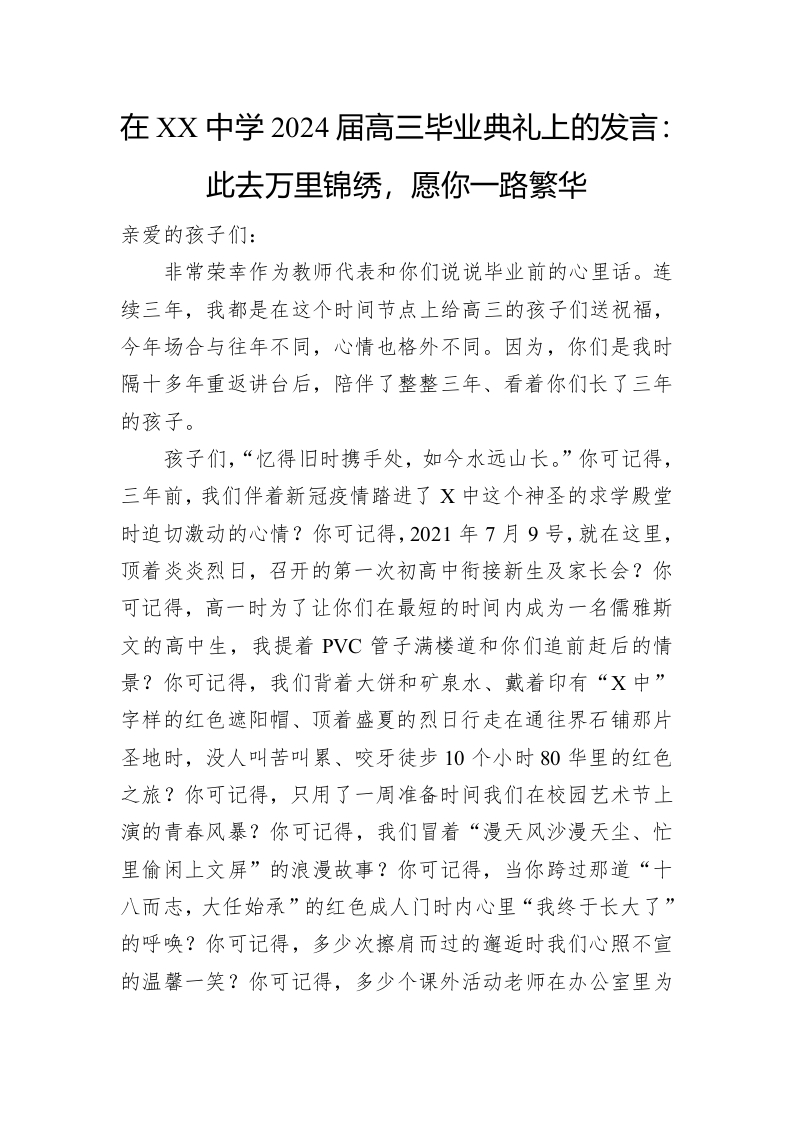 / 在XX中学2024届高三毕业典礼上的发言:此去万里锦绣,愿你一路繁华