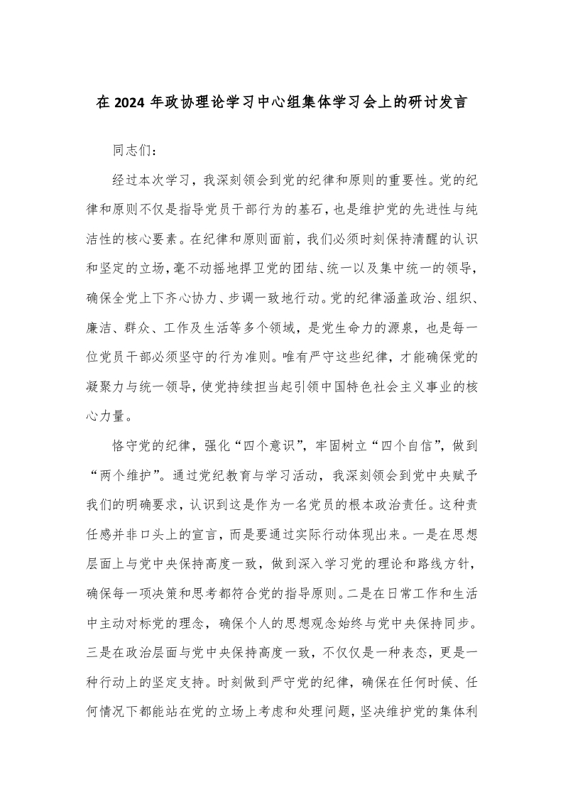 / 在2024年政协理论学习中心组集体学习会上的研讨发言