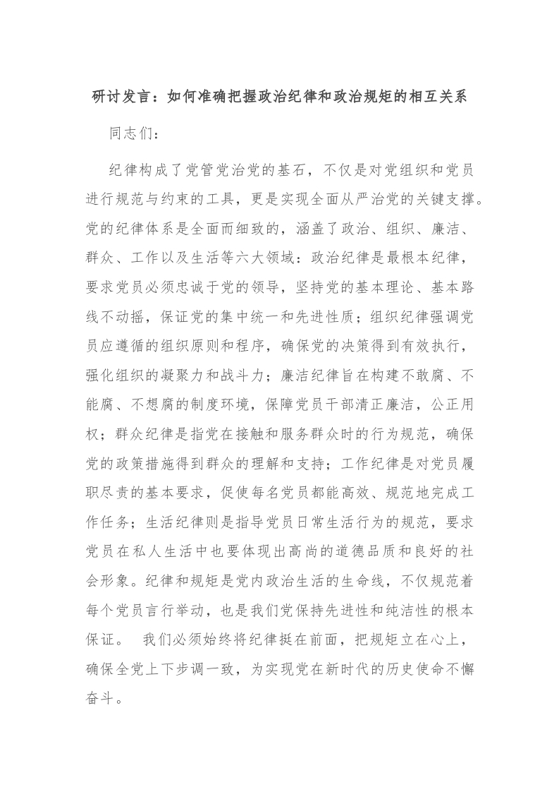 / 研讨发言:如何准确把握政治纪律和政治规矩的相互关系