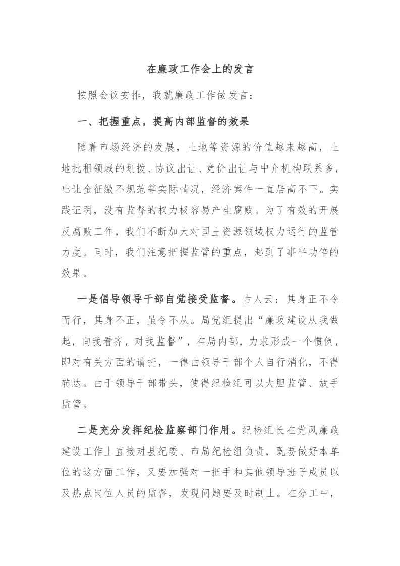 / 在廉政工作会上的发言