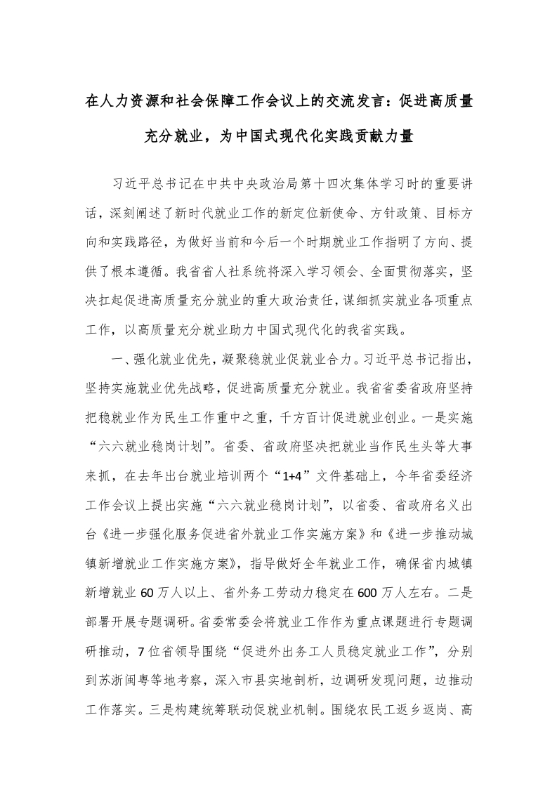 / 在人力资源和社会保障工作会议上的交流发言:促进高质量充分就业,为中国式现代化实践贡献力量