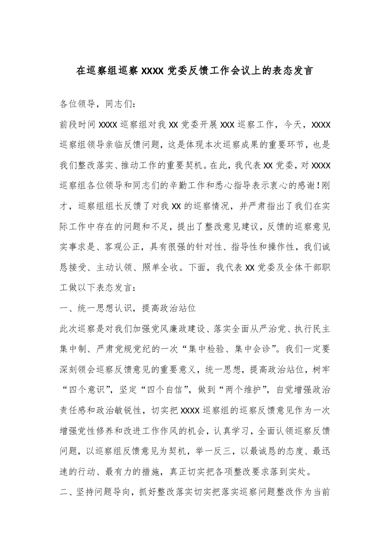 / 在巡察组巡察XXXX党委反馈工作会议上的表态发言