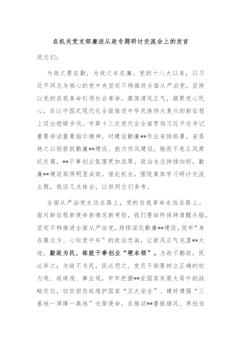 / 在机关党支部廉洁从政专题研讨交流会上的发言