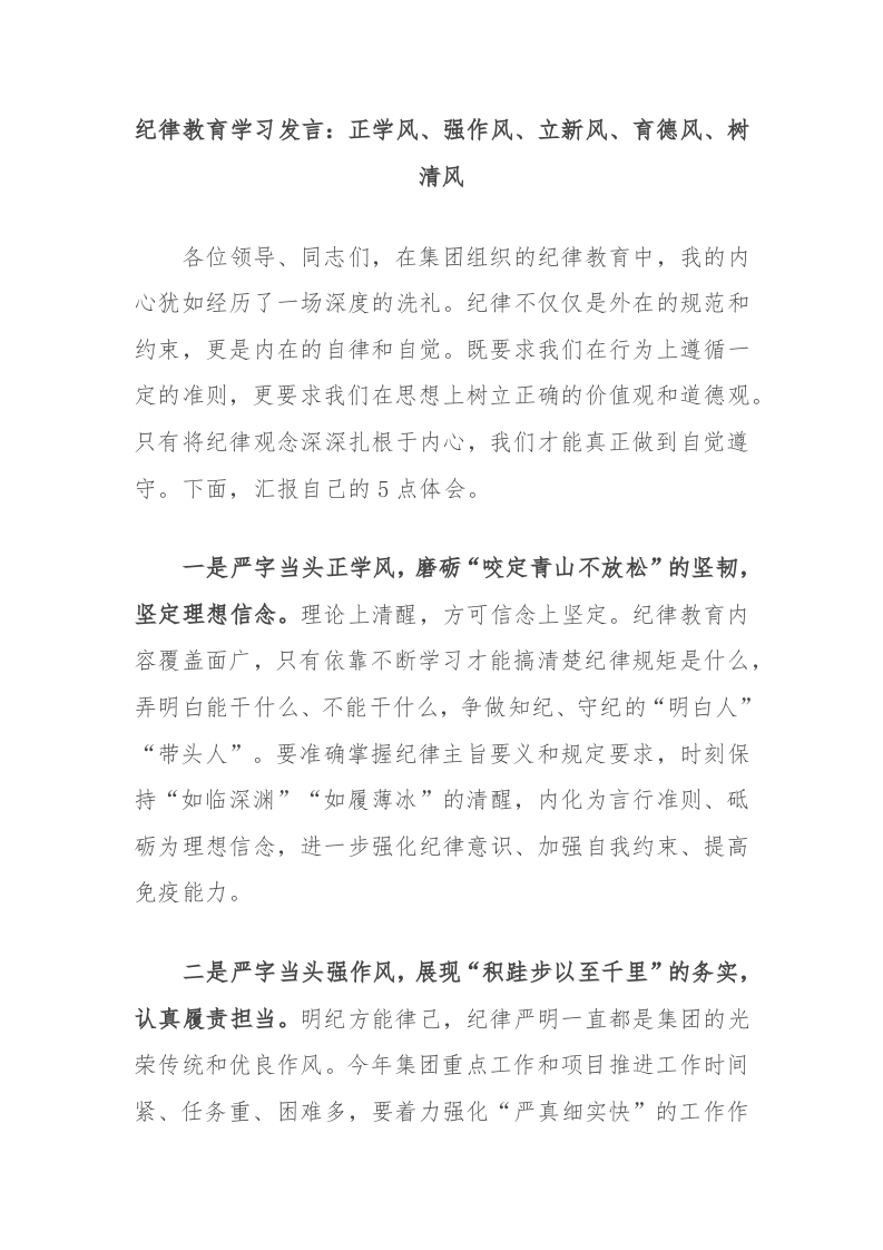 / 纪律教育学习发言:正学风、强作风、立新风、育德风、树清风