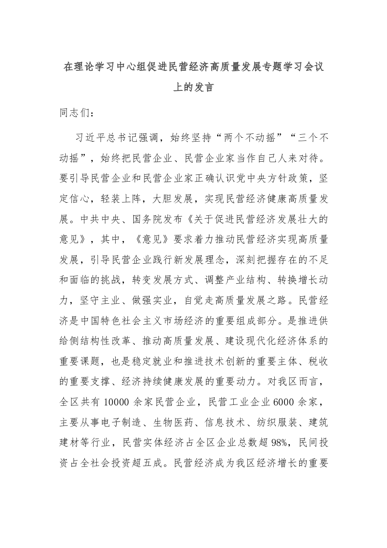 / 在理论学习中心组促进民营经济高质量发展专题学习会议上的发言