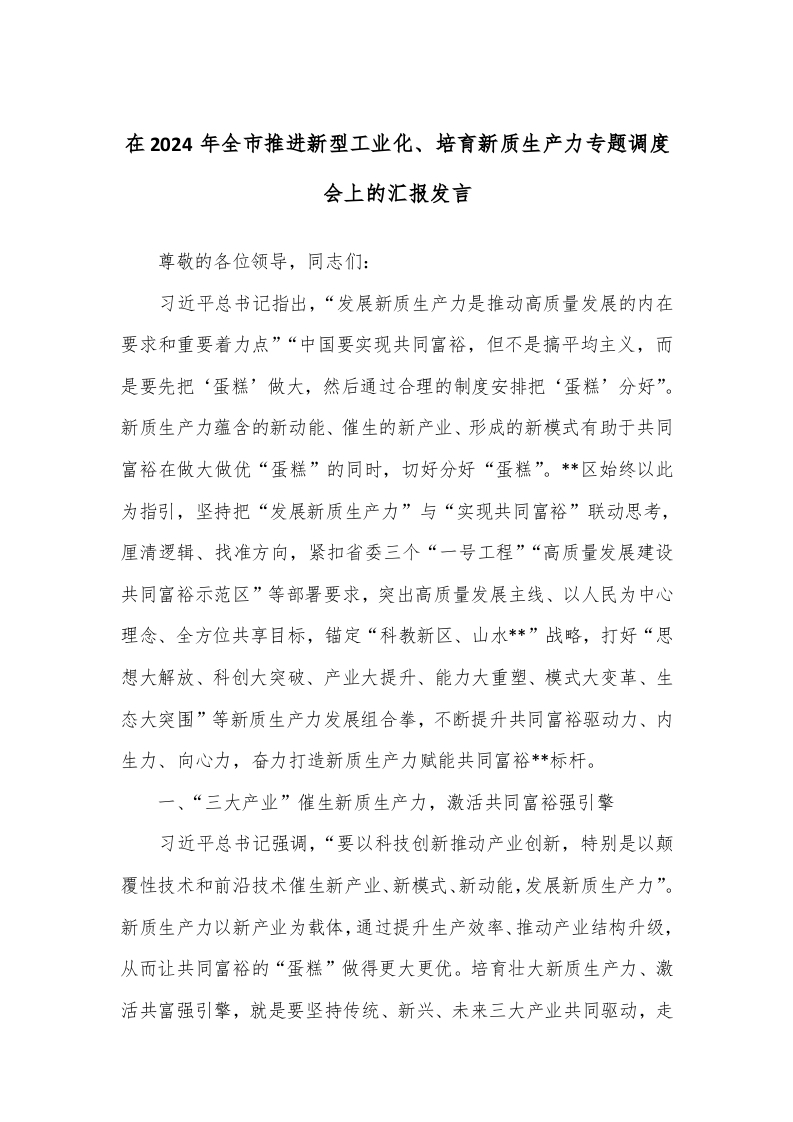 / 在2024年全市推进新型工业化、培育新质生产力专题调度会上的汇报发言
