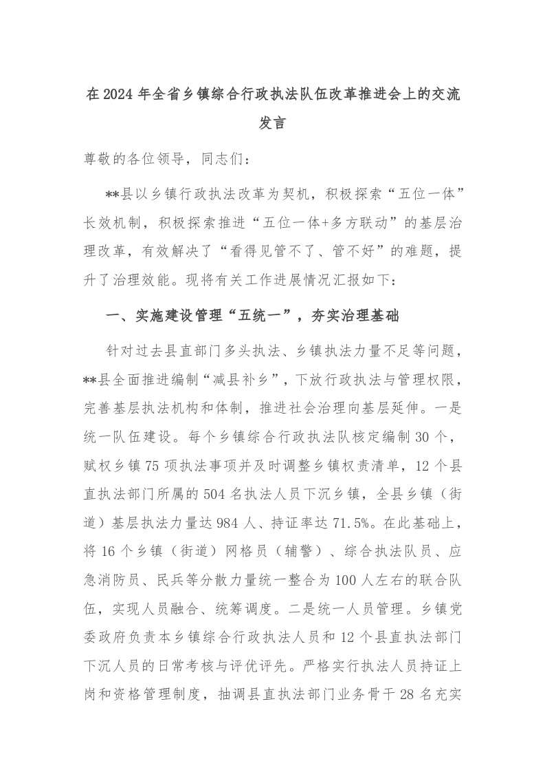 / 在2024年全省乡镇综合行政执法队伍改革推进会上的交流发言