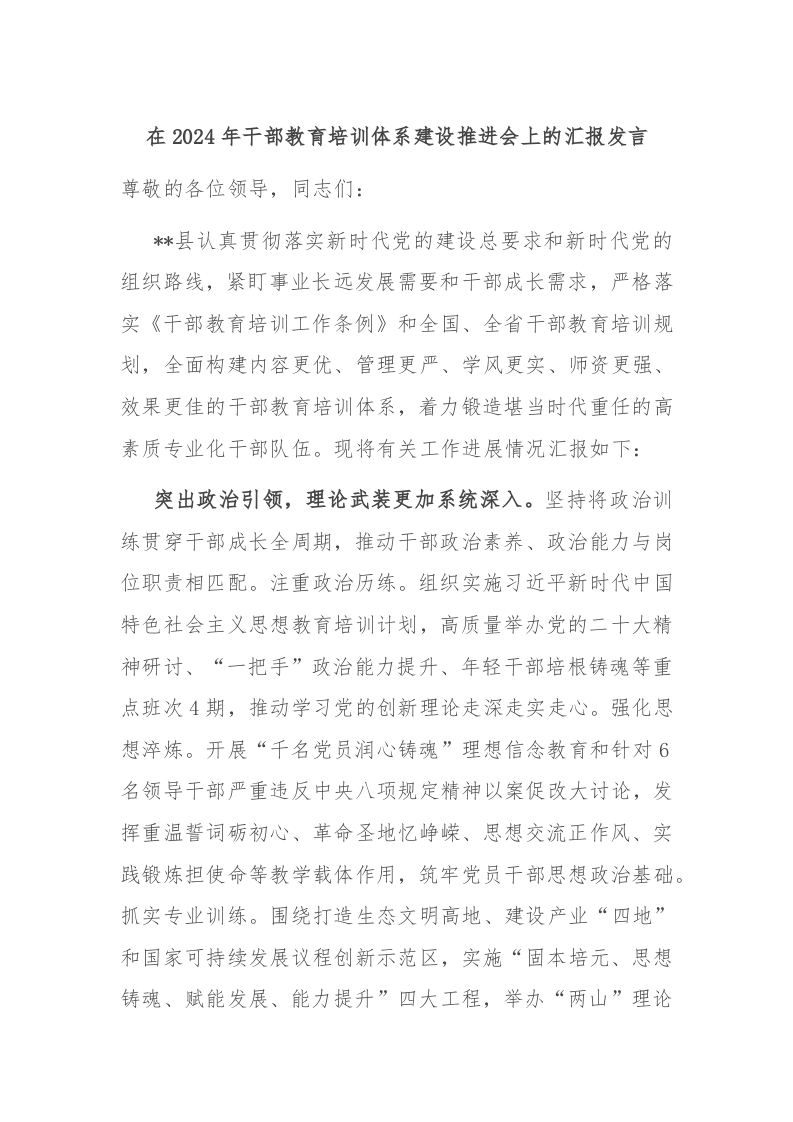 / 在2024年干部教育培训体系建设推进会上的汇报发言