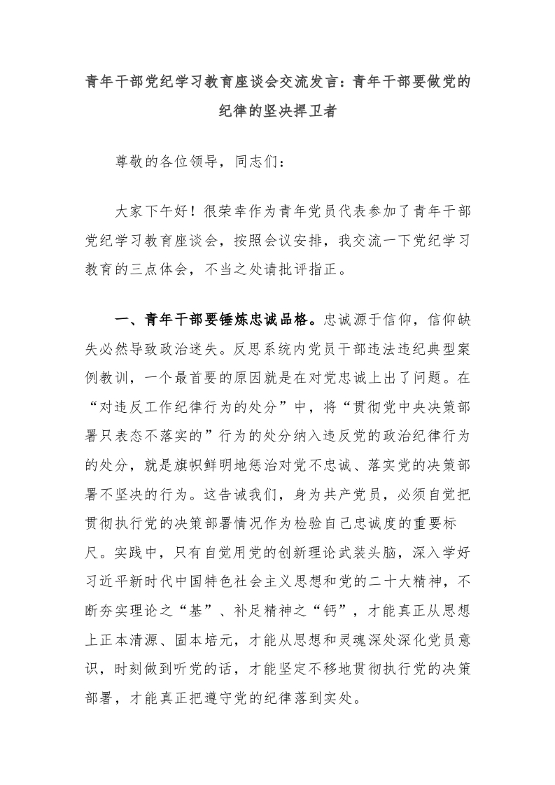 / 青年干部党纪学习教育座谈会交流发言:青年干部要做党的纪律的坚决捍卫者