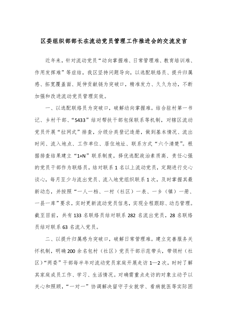 / 区委组织部部长在流动党员管理工作推进会的交流发言