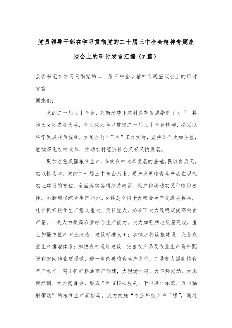/ (7篇)党员领导干部在学习贯彻党的二十届三中全会精神专题座谈会上的研讨发言汇编
