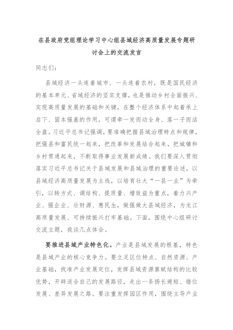 / 在县政府党组理论学习中心组县域经济高质量发展专题研讨会上的交流发言