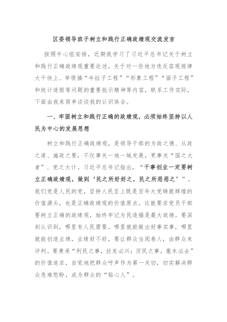 / 区委领导班子树立和践行正确政绩观交流发言