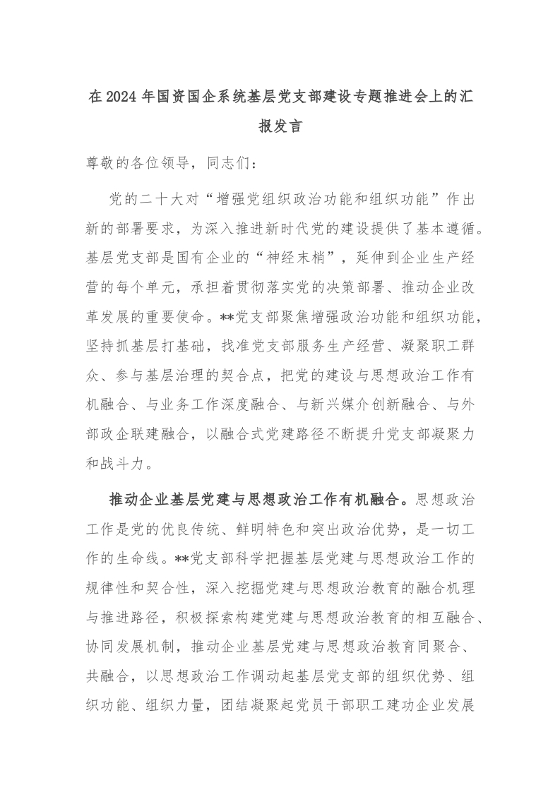 / 在2024年国资国企系统基层党支部建设专题推进会上的汇报发言