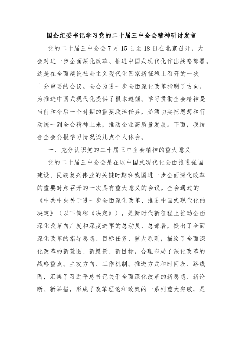/ 国企纪委书记学习党的二十届三中全会精神研讨发言
