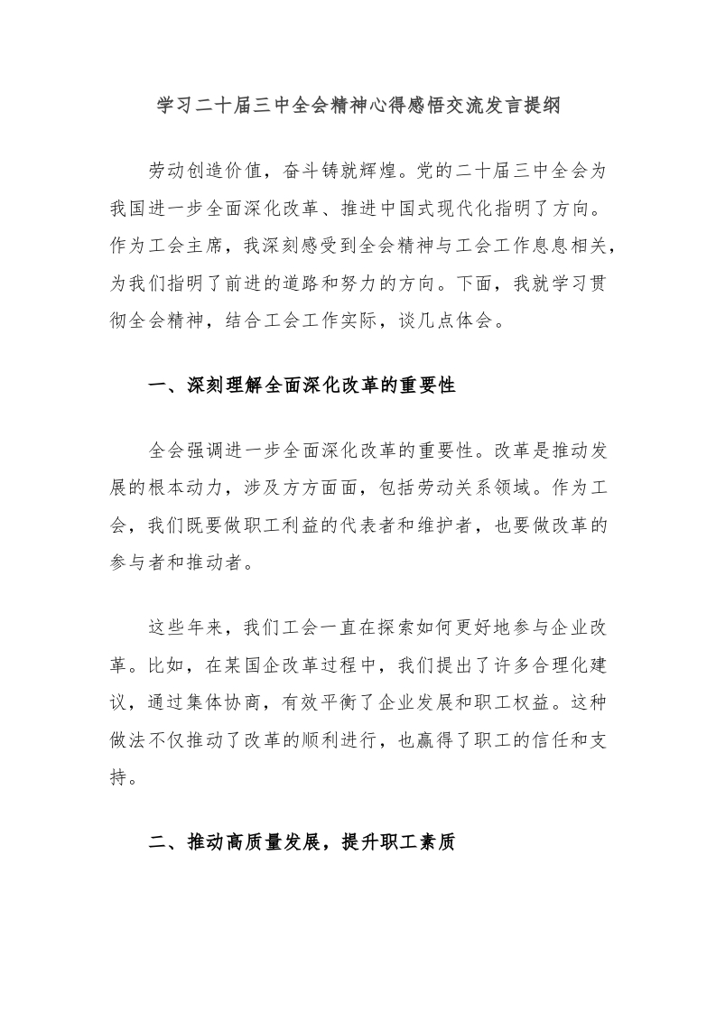 / 学习二十届三中全会精神心得感悟交流发言提纲