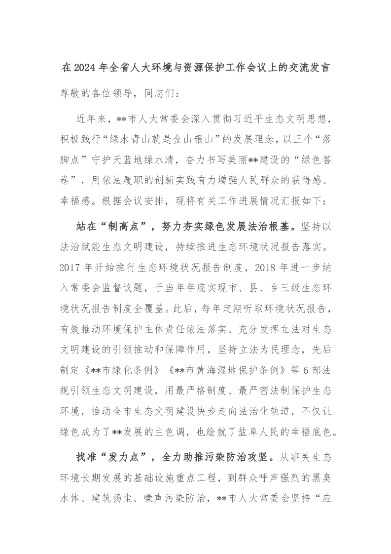 / 在2024年全省人大环境与资源保护工作会议上的交流发言