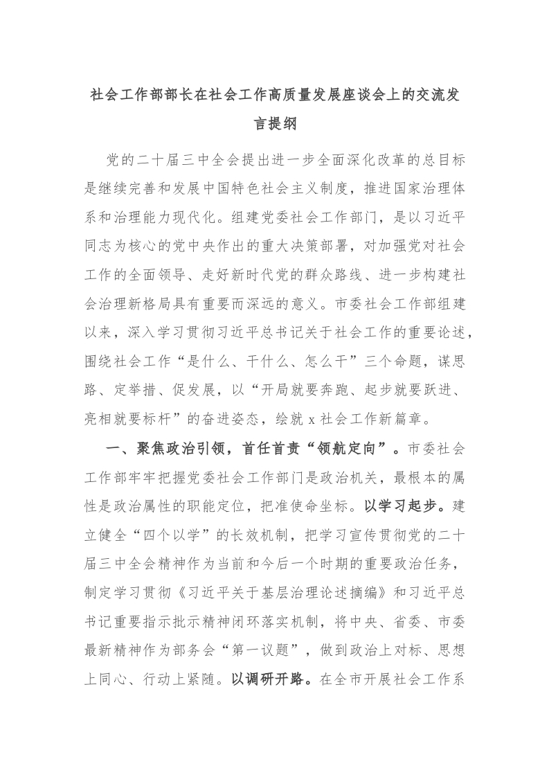 / 社会工作部部长在社会工作高质量发展座谈会上的交流发言提纲