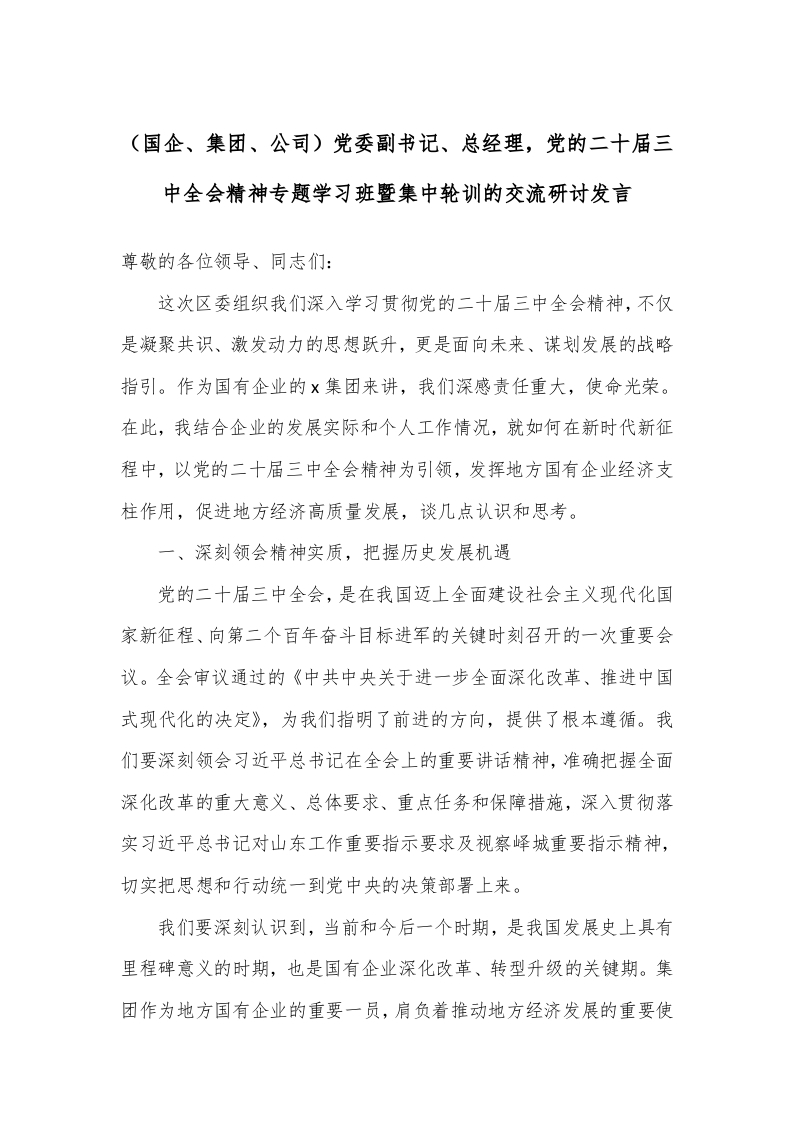 / (国企、集团、公司)党委副书记、总经理,党的二十届三中全会精神专题学习班暨集中轮训的交流研讨发言