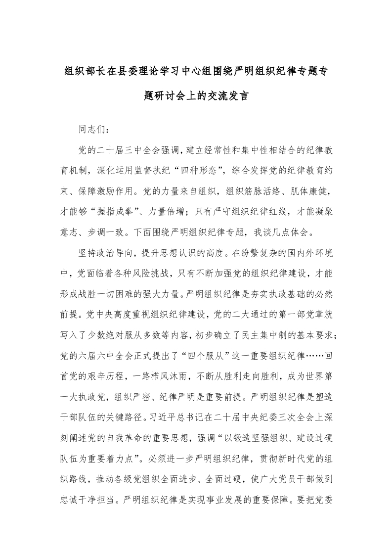 / 组织部长在县委理论学习中心组围绕严明组织纪律专题专题研讨会上的交流发言