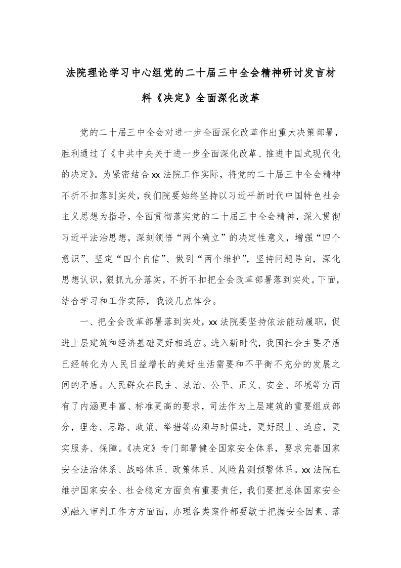 / 法院理论学习中心组党的二十届三中全会精神研讨发言材料《决定》全面深化改革