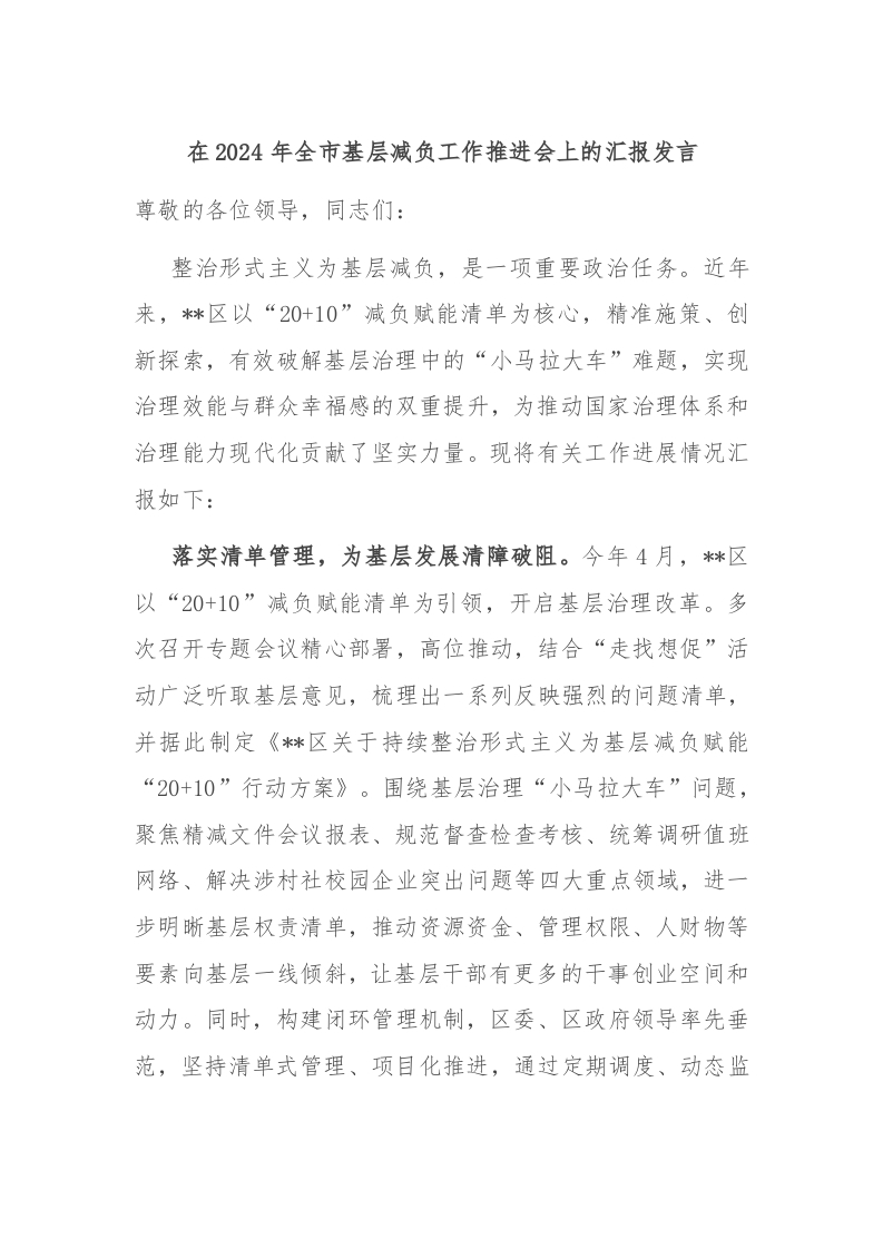 / 在2024年全市基层减负工作推进会上的汇报发言
