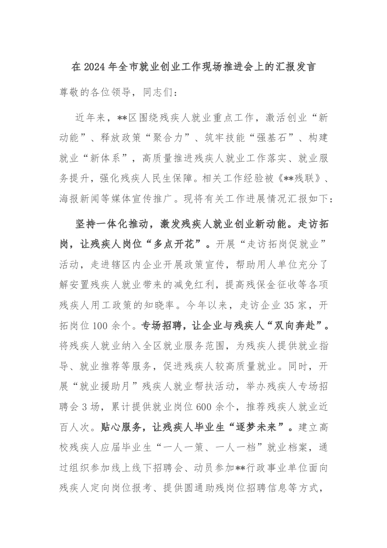 / 在2024年全市就业创业工作现场推进会上的汇报发言