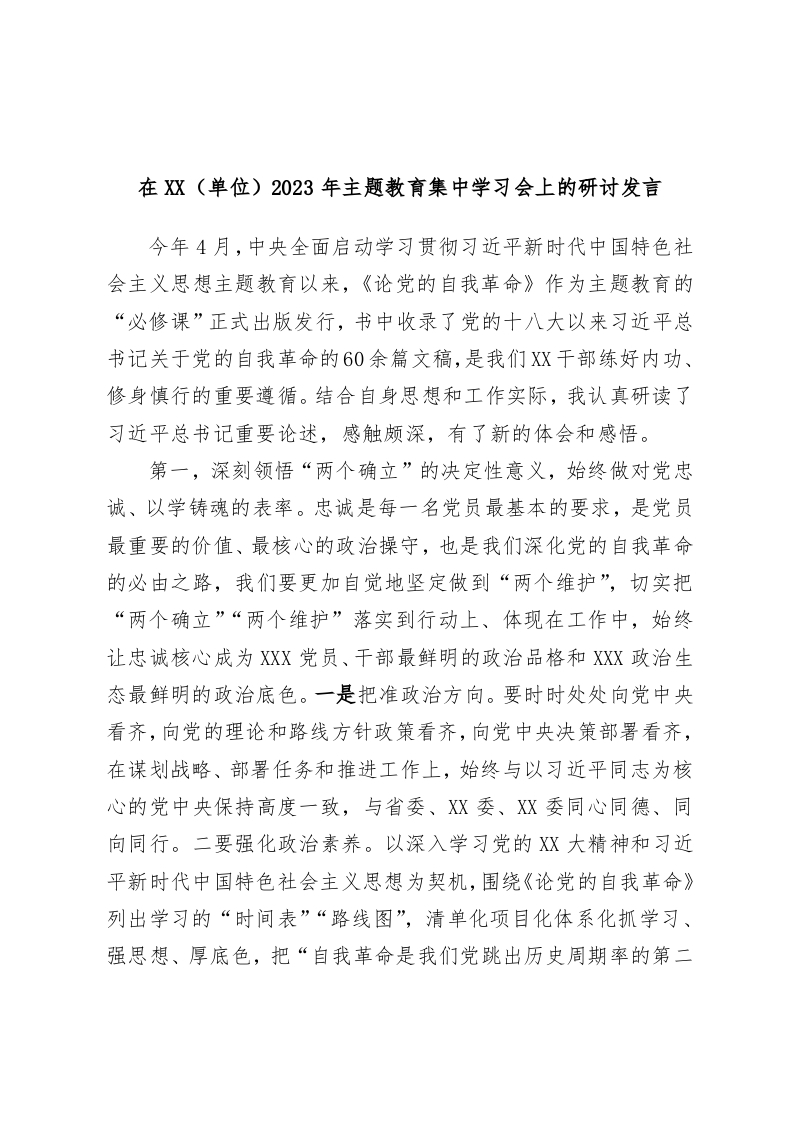 / 在XX(单位)2023年主题教育集中学习会上的研讨发言