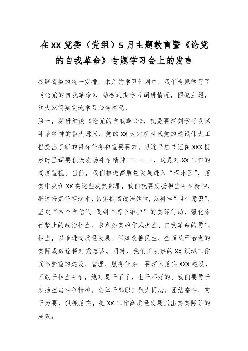 / 在XX党委(党组)5月主题教育暨《论党的自我革命》专题学习会上的发言