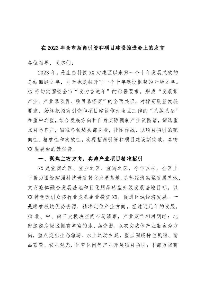 / 在2023年全市招商引资和项目建设推进会上的发言