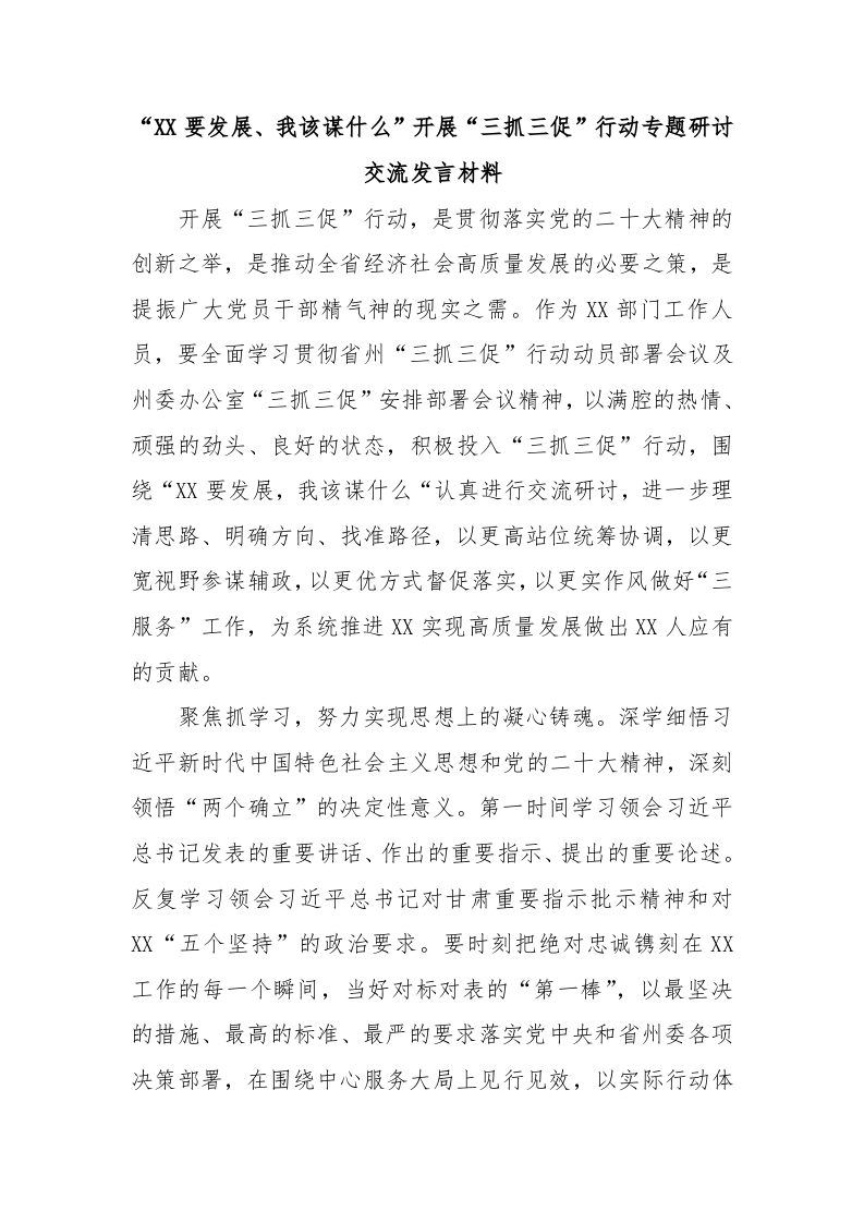 / “XX要发展、我该谋什么”开展“三抓三促”行动专题研讨交流发言材料