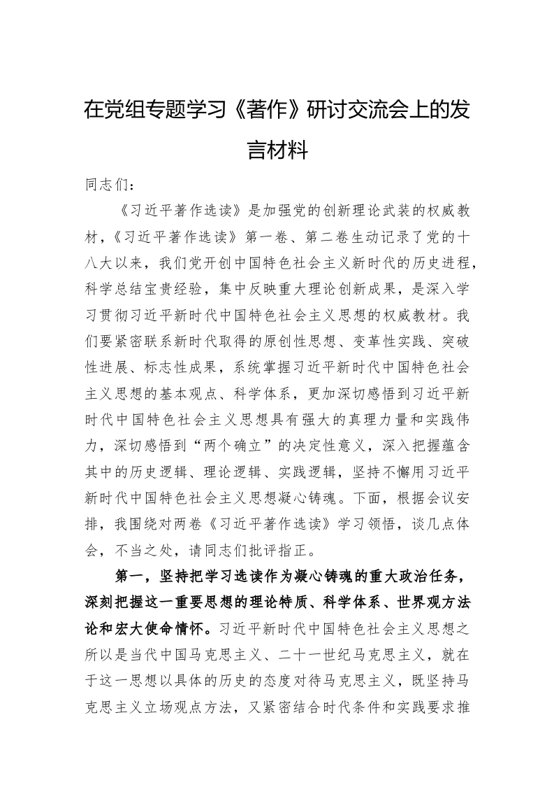 / 在党组专题学习《著作》研讨交流会上的发言材料