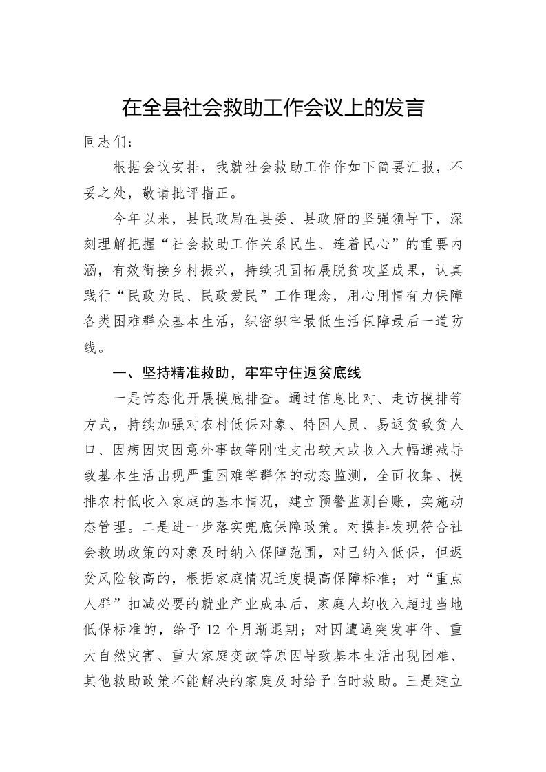 / 在全县社会救助工作会议上的发言