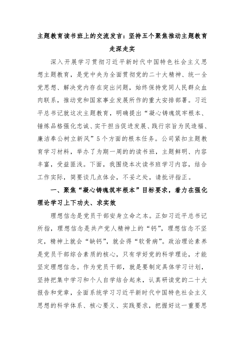 / 主题教育读书班上的交流发言:坚持五个聚焦推动主题教育走深走实