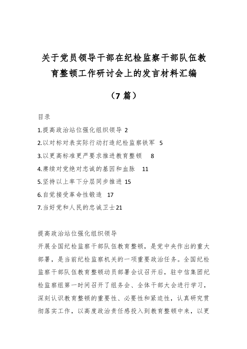 / (7篇)关于党员领导干部在纪检监察干部队伍教育整顿工作研讨会上的发言材料汇编