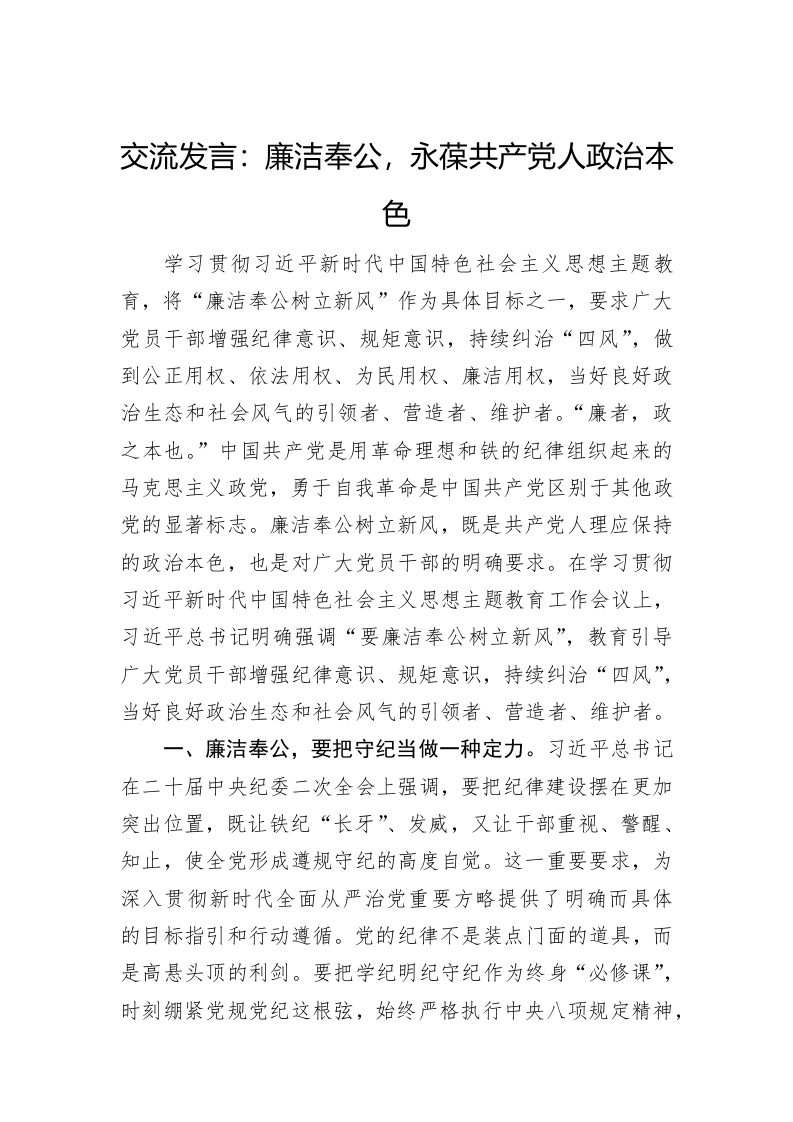 / 交流发言:廉洁奉公,永葆共产党人政治本色