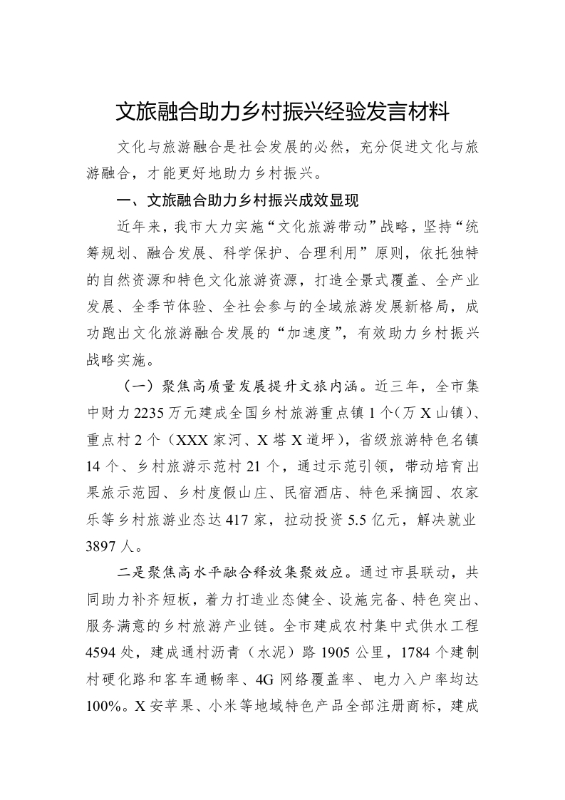 / 文旅融合助力乡村振兴经验发言材料