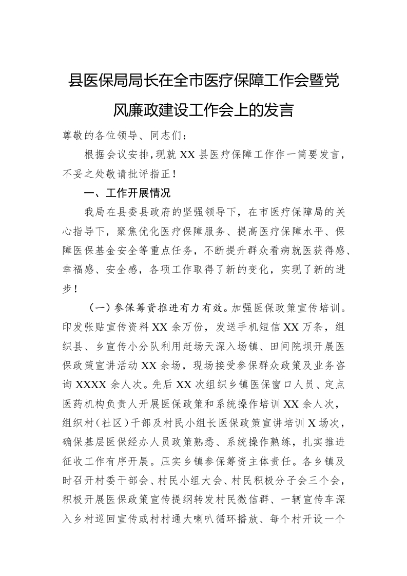/ 县医保局局长在全市医疗保障工作会暨党风廉政建设工作会上的发言