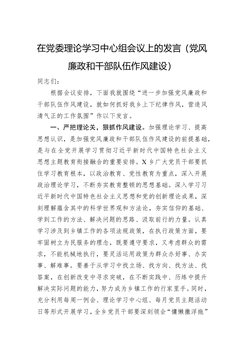 / 在党委理论学习中心组会议上的发言(党风廉政和干部队伍作风建设)