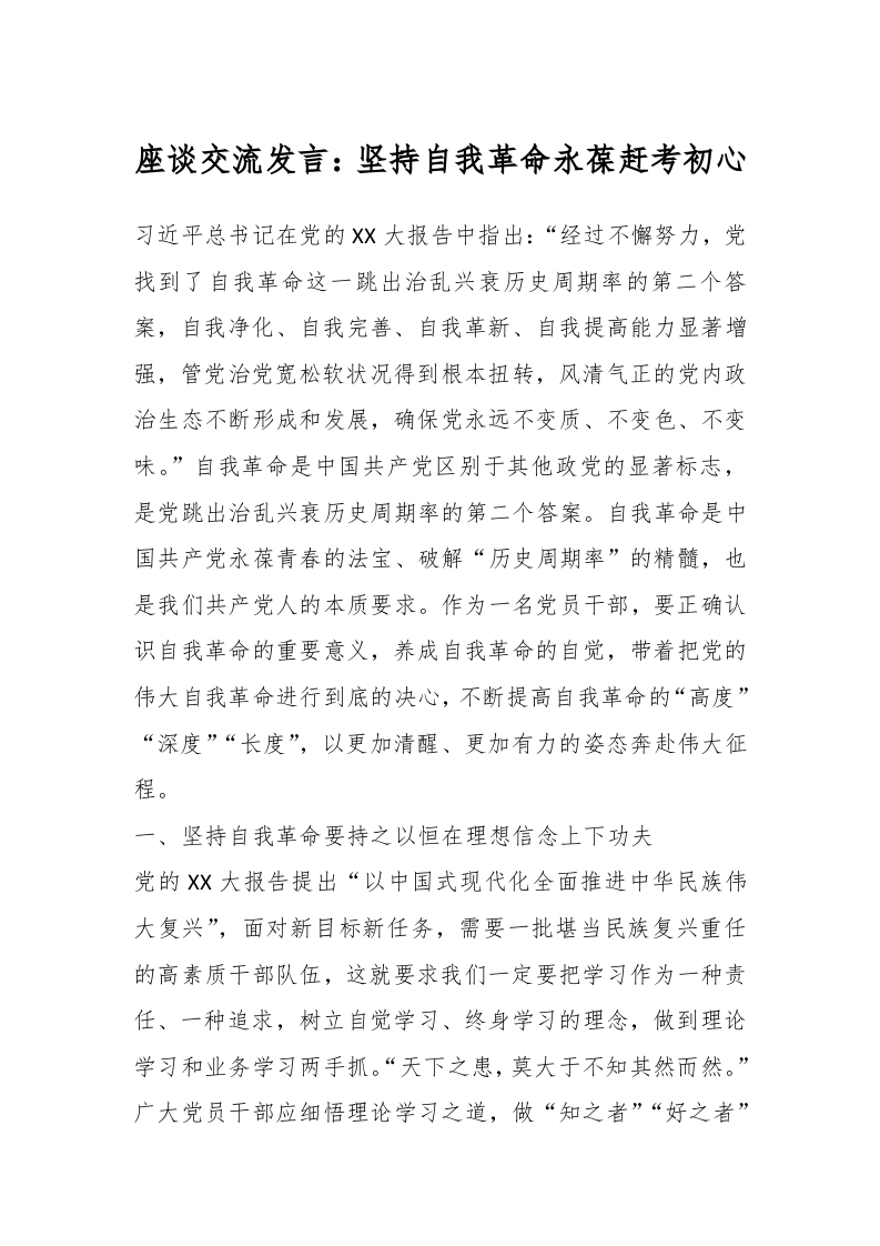 / 座谈交流发言:坚持自我革命永葆赶考初心