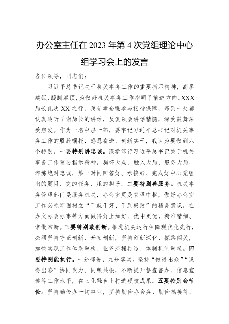/ 办公室主任在2023年第4次党组理论中心组学习会上的发言